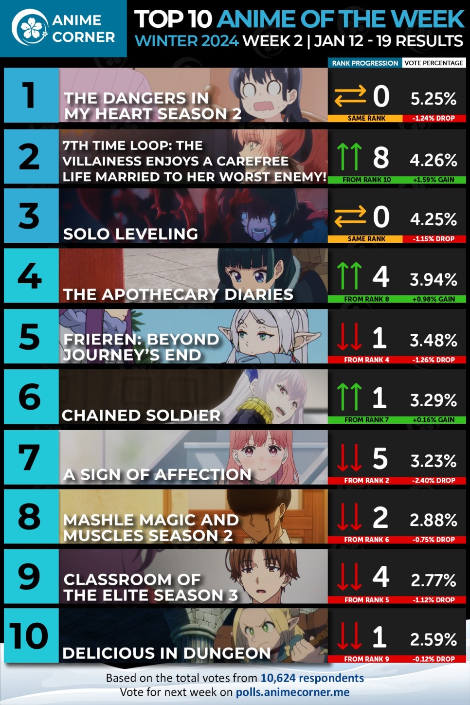외에서 매긴 2024년 1분기 애니 순위(애니 랭킹) 및 일본 애니 순위 2주차입니다. Anime corner에서 1월 12일 ~ 1월 19일까지 투표를 통해 정해진 일본 애니 순위입니다. 총 10,624명의 응답자로 측정된 순위입니다.